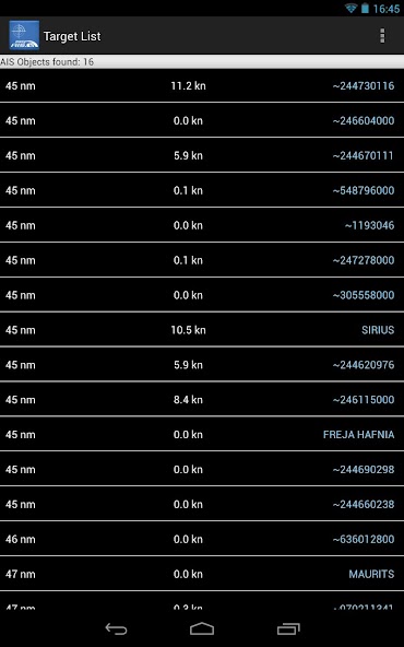 Basta tocar na tela em um alvo da AIS leva você a uma lista com todos os detalhes transmitidos desse alvo, por exemplo, posição do GPS, corpeia sobre o solo, velocidade sobre o solo, nome do navio, indicativo, comprimento, largura, rascunho, porto de registro…
